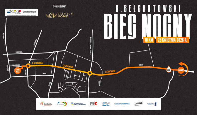 Miejskie Centrum Sportu w Bełchatowie informuje, iż w związku z organizacją „8. Bełchatowskiego Biegu Nocnego”, w dniu 25.04.2026 r. (sobota) na terenie miasta wystąpią utrudnienia w ruchu drogowym. Start biegu zaplanowany jest o 21:00.