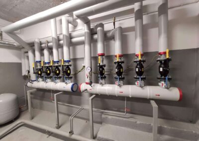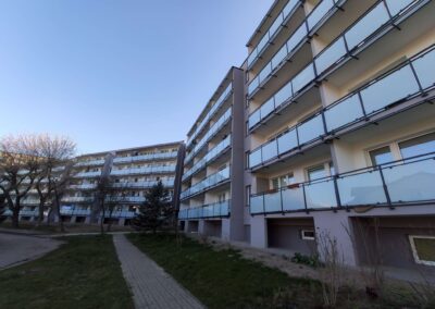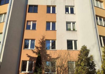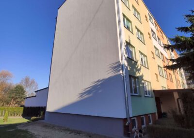 W ramach tego przedsięwzięcia oprócz kontynuacji remontu logii balkonowych, wykonano wymianę starego węzła cieplnego na nowy, montaż zaworów termostatycznych na grzejnikach, docieplenie ścian zewnętrznych uskoków osłoniętych blachą trapezową oraz malowanie elewacji i wejść w przestrzeniach pomiędzy balkonami.